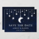 Celestial Save The Date engagement announcement card. Watercolor blue night sky with stars and the moon. Bokeh string lights.