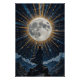 "An awe-inspiring embroidered artwork crafted entirely with thick, tactile threads to evoke a sense of wonder and grandeur. The central figure, viewed from behind, stands atop a rugged embroidered mountain peak, their flowing cloak or gown rendered with rich, textured stitches that convey movement and depth. They gaze upward, perhaps with an arm outstretched, toward a magnificent celestial event dominating the embroidered night sky. The moon is depicted as a massive, luminous full moon stitched with radiant white and silver thick threads, serving as the focal point of a spectacular starburst. Brilliant rays of embroidered golden, yellow, and celestial blue light radiate outward, along with countless embroidered stars, creating a dynamic explosion of cosmic energy.
