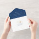 This navy blue and gold wedding invitation marks the commencement of your splendid matrimonial voyage. It thoughtfully combines the core invitation with a detachable RSVP card and a section for wedding details, including your web address, presenting a harmonious blend of elegance and luxury. Decorated with motifs of the cosmos, such as the crescent moon, a radiant sun halo, twinkling stars, wandering planets, and vast constellations, it captures the enigmatic allure of a night sky drenched in stars. Tailor-made for themes like "Under the Stars," "Written in the Stars," or "To the Moon and Back," it's an invitation for your guests to join in on an enchanting and romantic odyssey.