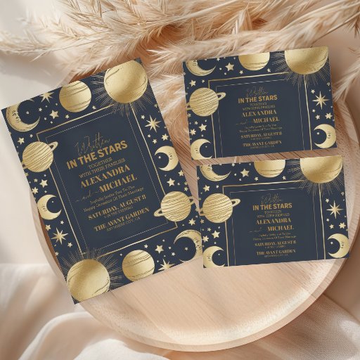 The all-in-one invitation is designed to include all essential wedding details in a seamless, foldable format. When opened, the invitation reveals the couple's names prominently displayed in elegant script, with the wedding date and venue details carefully arranged beneath in a refined serif font. The luxurious gold foil text complements the celestial elements, creating a cohesive and polished look.