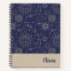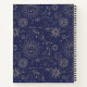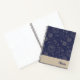 Customizable notebook features hand drawn celestial and astronomical designs including suns, planets and stars on dark navy background.