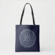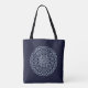 A lace-like concentric circle mandala in light blue with bright blue and gold star-like dots spangled among the layers makes for a fun, design that brings to mind a starry night sky. This bag is available in multiple sizes and both tote bag and cross body bag styles.