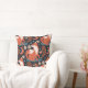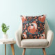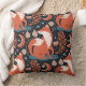 A red fox is the main feature in the pattern on this distinctive throw pillow. The fox image is surrounded by boho style flowers, leaves, symbols, and crescent moons. Predominant colors include cinnamon brown, slate blue, tan, and navy blue. Both sides have the same image.
