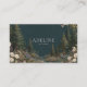 Discover a tranquil clearing where the forest meets the stars with this serenely magical business card. The design features a deep teal, star-dusted night sky that creates a breathtaking backdrop for a peaceful woodland scene. Majestic evergreen and pine trees rise from the banks of a gently flowing stream, while the foreground is adorned with an abundant floral border. Lush, elegant white blossoms and a mix of colorful wildflowers create a soft, romantic frame. A delicate, double-lined gold border at the top and bottom adds a final touch of understated sophistication, perfectly balancing the rustic charm with refined elegance.
