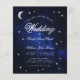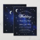 A budget wedding invitation for a celestial wedding theme, with the moon and star on a starry night blue background. The word Wedding and the names are written in an elegant calligraphic script. The moon and the word Wedding are faux silver foil, the rest of the text is white. On the black, there is only the moon and star on a starry night blue background.
