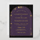 A modern, elegant wedding invitation template with a celestial, moon and stars, tarot, fortune teller theme, featuring a double, gold boho arch frame and celestial elements: the sun, the moon, the chalice, constellations, stars... on a purple, black and gold color scheme. Real gold foil accents elevate this invitation. A lovely space, universe, horoscope, zodiac, celestial themed wedding invitation design for a modern bride.