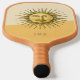 Pickleball paddle features celestial Sun face with geometric colorblock background and customizable gold brown text for monogram or name,