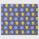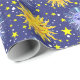 deep blue wrapping paper printed with serene moons, smiling suns, and yellow and white stars.