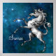 Beautiful poster has vintage heraldry style unicorn illustration set on celestial skies background. Customize with name or other text in white script font.