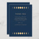 Add a touch of cosmic elegance to your event with our Celestial Wedding Thank You Card. Immerse yourself in the enchanting simplicity of our design, reflecting the mesmerizing magic of celestial bodies. Our trendy yet timeless design showcases a series of moon phases artistically rendered in gold on a striking navy blue backdrop. This touch of gold adds a hint of warmth and twinkling charm to the cool midnight blue base, further enhancing the inviting allure of the piece. The design maintains a minimalist approach, allowing the celestial elements to truly shine. You can easily personalize to suit your needs, ensuring that each piece echoes your unique style.