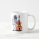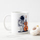 A unique mug featuring a cartoonish astronaut in a white spacesuit playing a vibrant orange-brown cello against a solid black background. Perfect for music and space enthusiasts!"