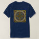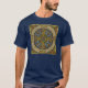 An elaborate compass made of Celtic knotwork, printed in silver and copper metallic color accents on the face and corners as well. Degrees are marked off from 10-90 in each quadrant. Around the compass, all four cardinal points are labeled in engraved-looking Irish-Gaelic on brass color plates, subpoints are labeled in Irish-Gaelic, and twelve elemental points as well: earth, storm, lightning, metal, air, sun, wind, wood, water, fire, spirit, stone. Also, subtle, decorative rune work decorates an inner ring.