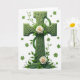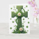 The front design shows a deep green Celtic cross centered on a bright white background, its knotwork carved with raised detail that catches soft light and leaves gentle shadows in the grooves. Fresh green vines and leafy sprigs curl around the cross as if they’re reaching in for a close embrace, adding a quiet sense of togetherness 💚. A creamy white rose sits right at the cross’s middle, and a second rose rests near the base, their pale petals leaning toward the green as though sharing a tender moment. Small four-leaf clovers are scattered across the white space like little lucky notes ☘️. The lighting stays soft and even, giving the cross a sculpted look without harsh glare. The greeting text is placed near the top in green, standing out clearly against the white. More clovers drift lightly around the edges, leaving the cross and roses as the main focus.