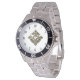 Has heft and feel of expensive stainless steel quartz watches. Good band with safety catch. I removed links, which is easy because engraved arrows show direction to push the linking pins. As always by this seller, the image (a railroad logo) is a perfect reproduction of my emailed image, and is precisely spaced and aligned.