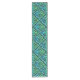 A table runner with a blue-green Celtic knot repeated diamond tile design against a black background.