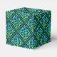 A favor box with a blue-green Celtic knot repeated tile pattern against a black background.