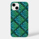 An iPhone 14 Case with a blue-green Celtic knot repeated tile pattern against a black background. Not an iPhone 14? No worries, it's also available for other device types =)