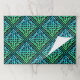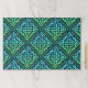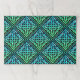A set of table place mats with a blue-green Celtic knot repeated tile pattern against a black background.