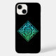 An iPhone 14 Case of a blue-green Celtic knot diamond design against a black background.