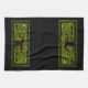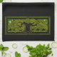 Surrounded by a border of celtic knots, a stylized, mystical forest and riders in tones of green.