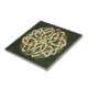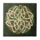 A traditional ancient Celtic ornament, showing four dragon- or snakelike creatures entwined in Celtic knots to form an intricate circle. The ornament is textured in greens and tans on a background of dark green with decorative texture.