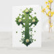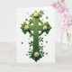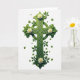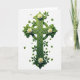 At the center of the card is a Celtic cross set on a bright white background, its interlocking knotwork drawn with careful detail that feels timeless and steady. The cross is shaded in rich emerald tones, with lighter and darker greens giving it depth 💚. Four cream-colored roses rest at the top, the left and right arms, and the base, their soft petals leaning into the green lines like a gentle touch between close friends. Small clusters of green leaves tuck in around each rose, adding a fresh, garden-like contrast to the woven pattern. Across the open white space, a few three-leaf shamrocks drift as if carried on a light breeze ☘️. Near the top, a short St. Patrick’s Day greeting appears in small green lettering, leaving the cross as the main focus. The shamrocks are scattered unevenly around the cross, with a couple near the upper corners and a few closer to the lower edge.