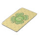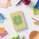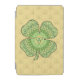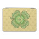 This classic four leaf clover overlays a concentric circle design featuring layers of Celtic weaves in multiple shades of green with a bit of orange for accent.