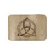 A bath mat featuring a simple colored Celtic triquetra interlaced with a circle forming a trinitarian symbol against a wood background, representing spiritual unity with the divine.