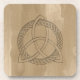 A cork coaster with a simple Celtic triquetra interlaced with a circle forming a trinitarian symbol craved against a wood background, representing spiritual unity with the divine.