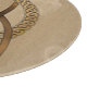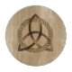 A cutting board featuring a simple colored Celtic triquetra interlaced with a circle forming a trinitarian symbol against a wood background.