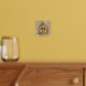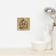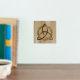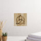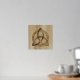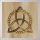A foil print featuring a simple colored Celtic triquetra interlaced with a circle forming a trinitarian symbol against a wood background, representing spiritual unity with the divine.