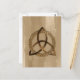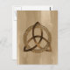 Simple colored Celtic triquetra interlaced with a circle forming a trinitarian symbol craved against a wood background, representing spiritual unity with the divine.