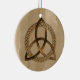 A round ornament featuring a simple colored Celtic triquetra interlaced with a circle forming a trinitarian symbol against a wood background, representing spiritual unity with the divine.