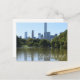 Features an original color photograph of Central Park Lake with green trees and the architecture of midtown in the distance. Photographed in New York City.