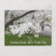 Focus on a single tree in springtime in Central Park in New York City. Branches of blossoming trees reach down with their delicate white flowers open to the sky. Nature bursts forth with new life here. Busy with visitors and locals out and about enjoying fresh air and calm moments. Central Park welcomes visitors from all over the world to wander, explore, and relax in this busy city.