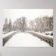 This black and white fine art photo is of a beautiful winter landscape in Central Park, New York City. The view looks out over Bow Bridge, one of Central Park's most romantic cast-iron bridges, toward gorgeous Manhattan buildings past winter trees. Snow blankets Bow Bridge and the rest of Central Park giving this image a magical feel: like it is part of a wonderful winter dream.