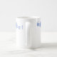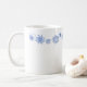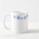 Holiday winter ceramic coffee mug shown with a festive blue snowflakes border.