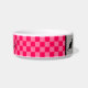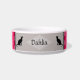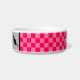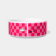 Cat food bowl made of white ceramic has a beautiful two tone pink checker design and a gray backdrop for your pets name. Just add your cats name at the personalize option. His/her name will appear between the two cat graphics. . HAMbyWhiteGlove.