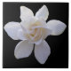 This stunning bloom is the Cape Jasmine Gardenia. There are a number of different gardenia varieties. This one is distinctive for the initial unfurling of the (usually six) outer petals, followed by a rose-like interior bloom. Gardenias have a wonderful, faintly spicy fragrance that makes it a popular choice for perfume makers. Thought to be named after Alexander Garden, a Charleston, South Carolina, physician, gardenias have also become associated with the South. Once quite popular in wedding bouquets, the flower is now infrequently used in bouquets because of their sensitive nature. You have to be very careful with the care and handling of these blooms. If the bloom is handled too much the petals will turn black. This spectacular bloom is offered here on a black backdrop for a truly striking design. You are, however, welcome to change the background color to better suit your personality or personal sense of style. This gorgeous tile makes an excellent trivet, coaster or accent tile in the kitchen or bath.