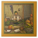 THE WONDERFUL IMAGE FEATURES AN ETHNIC MAN SEATED ON FLOOR AT A LOW TABLE, COVERED WITH A CLOTH. HE IS SURROUNDED BY VASES OF VARIOUS SHAPES, SIZES AND COLORS. EARTH TONES OF BROWN, GREEN, GRAY AND ORANGE. A TEXTURED LOOK WAS ADDED DIGITALLY. THESE DECORATIVE TILES MAKE NICE HOSTESS GIFTS!