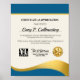 Universal certificate of excellence or appreciation featuring modern wavy design in blue and gold color scheme, faux gold seal or emblem; just add your text, logo, and upload a signature or delete and write in later.