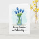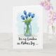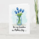 This card shows a clear glass jar filled with water, holding five closed blue flower buds in shades of cerulean and deep indigo, with fresh green stems and leaves reaching downward. Light glints through the glass with soft reflections, giving the scene a gentle, tender mood, like a quiet gesture of care ❤️. Behind the bouquet, a pale sky-blue wash forms a soft halo that fades into white, keeping the focus on the flowers. The jar sits on a muted, earthy surface tone that grounds the arrangement without distracting from it. Below the illustration, the message “For my Grandma on Mother’s Day ...” is placed prominently near the bottom in flowing, dark lettering. The spacing leaves plenty of open white area, making the words feel calm and affectionate, like a warm note left on the table 🌼. The blue watercolor backdrop is strongest behind the upper blooms and gradually lightens as it spreads outward.