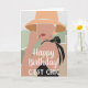 A portrait of an elegant French woman in a soft yellow sun hat and black halter top. She is wearing large earrings and red lipstick. An abstract background features soft, pastel green, gray and taupe shapes. Happy Birthday and C'est Chic is written at the bottom. The text can be changed. Modern and trendy style.