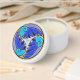 Japanese water lily design given radically new look in Leslie Sigal Javorek's original digital painting adorning this candle favor. Appears made w/ ceramic tiles in lilac, periwinkle, blue, aqua & ivory; at center is Hebrew "Chai" (Life). Pretty enough for the holidays or parties.
