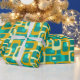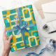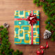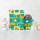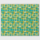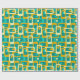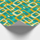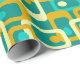 This wrapping paper has a mid-century modern design of rounded rectangles with ovals inside in retro colors of turquoise, teal, off-white, and gold.