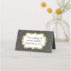 Chalkboard gray folded place card with a gold tone polka dot background. Graphics of a gold edged text plaque, on the front is ready to personalize by hand for each guest at your wedding. The back of the card has the same gold edged plaque with custom black text ready for you to change to read what you want.