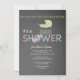 A charming invitation based on a chalkboard background which features a baby stroller, a delicate vine and the word "shower" in pink and blue.
