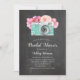 Chalkboard bridal shower. Pink flowers and camera Invitation