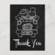 This black and white thank you wedding postcard features a cute hand drawn cartoon image of a bride and groom driving in a car highlighted against a black chalkboard background.