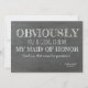 Funny proposal card "OBVIOUSLY YOU'RE GOING TO BE MY MAID OF HONOR (and no, that wasn't a question)." Feel free to change "Maid of honor" to "Matron of honor" or "Bridesmaid".